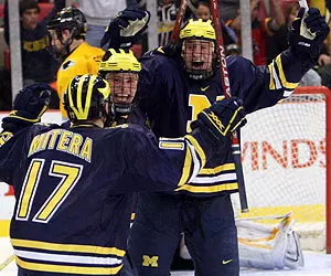 At 3:33 the Wolverines nearly won the game on a strange carom. Miller was tripped while skating with the puck in the slot and he and the puck slid into the net. After a video review it was decided that the net was dislodged before the puck crossed the goal line.