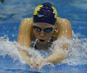 Five Wolverines crowded the top 10 of the 100-yard breaststroke to give Michigan a 66 point boost in the race. Junior Payton Johnson(Champaign, Ill./Centennial) clinched a victory in the B-final and then watched from the starting blocks as her teammates filled half of the lanes for the final individual event of the morning session. Kelly and Hannah Smith finished third and fourth while Katie Smith(Plano, Texas/Hebron) and Leigh Cole(Ann Arbor, Mich./Pioneer) claimed seventh and eighth. The four combined with Johnson and freshman Brett Pedley(San Diego, Calif./Torrey Pines) to chip off 19 points from Indiana's lead late in the morning session.