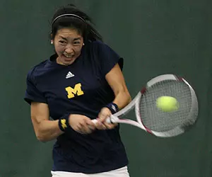 Notre Dame opened singles play with straight-set victories at Nos. 6 and 1, respectively, to jump out to a 3-0 advantage. Tatsuno kept Michigan in contention with an impressive 6-4, 6-4 upset win over39th-ranked Kristy Frilling at No. 2, moving her overall singles record to a team-best 12-5.