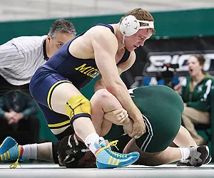 Junior/sophomore Anthony Biondo(Clinton Twp., Mich./Chippewa Valley HS) also spent much of his match in the top position, earning 3:18 in riding-time advantage to cap a 10-5 decision against Nick Palmieri. Biondo, ranked 13th nationally, struck with a quick first-period takedown and, despite giving up a late reversal, held onto a two-point edge after an escape and two MSU stalling calls. The Spartan wrestler scored out of a flurry midway through the second period to even the score, but Biondo controlled the remainder of the match with a reversal and third-period takedown. Palmieri spoiled Biondo's attempt at the major with a pair of late shots and subsequent stalemates as the Wolverine settled for the decision and his third straight win in Big Ten action.