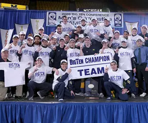 With tonight's first-place finish, Michigan is expected to gain its 11th consecutive NCAA Tournament berth. The Maize and Blue currently holds three NCAA titles, placing U-M in a three-way tie with Penn State and Ohio State for second-most national crows within the Big Ten Conference. Illinois holds the most NCAA titles with nine.