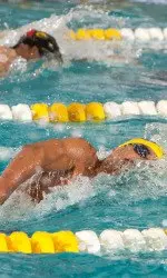 In the 'B' final of the 100-yard freestyle, Vinny Tafuto (Hummelstown, Pa./Hershey) tied for first with a time of 45.58. Among the U-M personal bests were Aaron Ghiglieri (Central Point, Or./Cascade Christian) touching at 45.68, and Colin Eaton (Gresham, Or./Corbett) clocking in at 46.23 during 100 free prelims.
