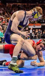 Murphy led the bout, 6-4, at the time of the fall and was in deep on a low single when Rohskopf countered him in a body lock, trapped the arm and earned the fall at the 5:43 mark. The Wolverine captain pushed the pace throughout, scoring on a double-leg takedown midway through the first period and nearly finishing on a fireman's carry at the first-period buzzer -- that was ruled a takedown then waved off. He reversed Rohskopf to his back for four points early in the second but was reversed back and ridden out. After giving up a quick escape in the third, he quickly fired off two single-leg shots, getting in trouble on the latter to give up the match-ending fall.
