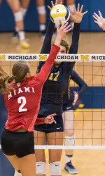 ANN ARBOR, Mich. -- Despite falling behind 1-0, the No. 23-ranked University of Michigan volleyball team used a .421 team attack percentage to defeat Colgate by a 3-1 score (22-25, 25-23, 25-9, 25-14) in the Wolverines' final match of the Michigan/EMU Challenge tournament on Saturday (Sept. 17) inside Cliff Keen Arena.